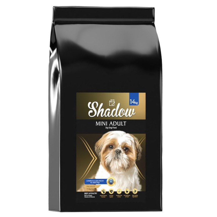 غذای خشک شَدو (SHADOW) با تمرکز بر روی نیازهای منحصر به فرد گربه ها و سگ ها و در نظر گرفتن تمامی جزئیات، غذایی کامل، بالانس شده، غنی شده با مکمل های ویتامینه و معدنی و تولید شده از مواد اولیه با بالاترین کیفیت است. ترکیبات آن شامل پروتئین گوشت طیور، پروتئین ماهی، پروتئین گوشت دام، برنج، گندم، ذرت، روغن سویا، روغن ماهی، مکمل های ویتامینه، مکمل های معدنی، اسيد آمينه هاي مؤثر در تراكم استخوان و عناصر کمیاب میباشد. غذای خشک سگ SHADOW مدل Mini Adult با پروتئین 30 درصد و چربی 12 درصد مناسب برای سگ های بالغ نژاد کوچک می باشد.