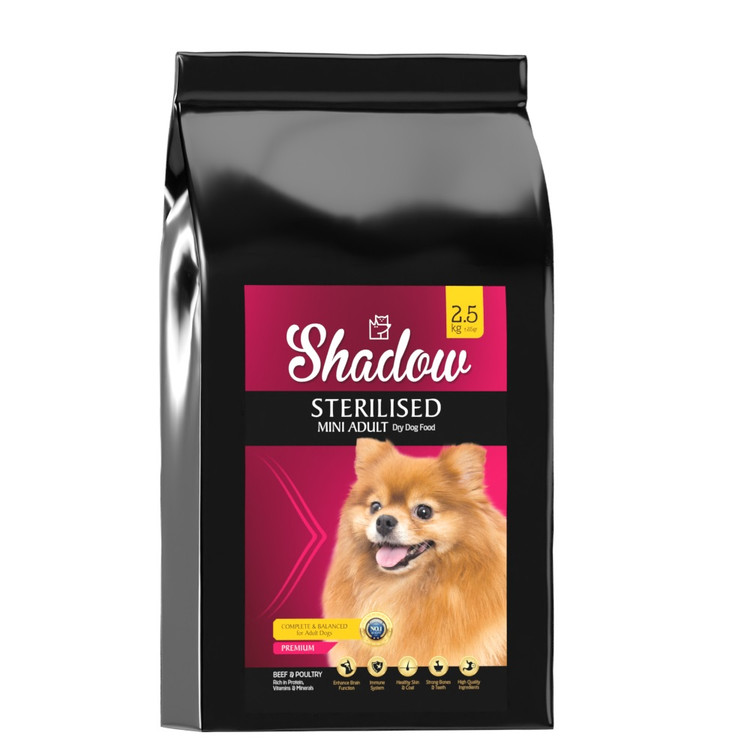 غذای خشک شدو (SHADOW) با تمرکز بر روی نیازهای منحصر به فرد گربه ها و سگ ها و در نظر گرفتن تمامی جزئیات، غذایی کامل، بالانس شده، غنی شده با مکمل های ویتامینه و معدنی و تولید شده از مواد اولیه با بالاترین کیفیت است. غذای Sterilised برند SHADOW به صورت تخصصی برای حیوانات خانگی عقیم شده تولید می شود با در نظر گرفتن تمامی نیازهای بدن آنها فرموله شده است. غذای خشک سگ SHADOW مدل Sterilised Mini Adult با پروتئین 26 درصد و چربی 9 درصد مناسب برای سگ های بالغ عقیم نژاد کوچک می باشد. ترکیبات آن شامل پروتئین گوشت طیور، پروتئین ماهی، پروتئین گوشت دام، برنج، گندم، ذرت، روغن سویا، روغن ماهی، لسیتین، مکمل های ویتامینه، مکمل های معدنی، اسيد آمينه هاي مؤثر در تراكم استخوان و عناصر کمیاب میباشد. حیوانات عقیم شده به دلیل تغییرات هورمونی به مرور کم تحرک تر می شوند به همین دلیل در معرض چاق شدن هستند و در نتیجه به انرژی بالایی نیاز ندارند و انرژی مورد نیازشان را با مقادیر کمتری از غذا تامین می کنند. نیازهای تغذیه ای حیوانات عقیم شده از نظر میزان پروتئین ، کالری و همچنین مکمل هایی مانند کلسیم، فسفر و منیزیم و ... و همچنین مقدار غذای روزانه متفاوت است.